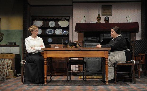Usually it’s the mother-in-law who gets it in the neck, here it’s the daughter-in-law very much in the in the firing line. Minnie Gascoyne gets a great (and long) build up before we meet her, as her new-ish husband and his mother lay into her in the kitchen, only to be interrupted by the news that he’s got another woman pregnant. It’s pretty steamy stuff for 1912, but DH Lawrence treats it all pretty matter-of-fact, melodrama and hyperbole cast aside for plain speaking and clear facts. Minnie and Luther’s marital dilemma and her headstrong, businesslike approach to finding a solution make her feel like something of a missing theatrical link – Nora slammed that door only twenty years perviously, Eliza was learning to talk proper at the same time, Amanda and Elyot’s unholy approach to matrimony was barely eighteen years away, and pretty soon Alison and Jimmy would be battling it out over the ironing board. Paul Miller‘s detailed and always clear production makes the best possible case for the play and for the somewhat uneasy conclusion that brings the couple to a curious reunion. According to DHL, overprotective mothers are the main problem, but it is interesting that he also shows that specific social issues – fair pay, sickness allowance and strikes – have a direct affect on domestic and romantic relationships. In a startling image, the unwashed miner kisses his wife with a ‘red mouth’ leering out of his blackened face, and, as you’d expect, DHL places the couple’s sexuality at the heart of their relationship; the sequence where he silently washes his coal-stained body in front of his wife brings a further frisson. Claire Price is a quietly determined heroine, her tears for the broken crockery speaking volumes about her and many other women’s plight, and Philip McGinley as her husband manages to engage us with a character crippled by lethargy. A pleasure to discover this play at last.